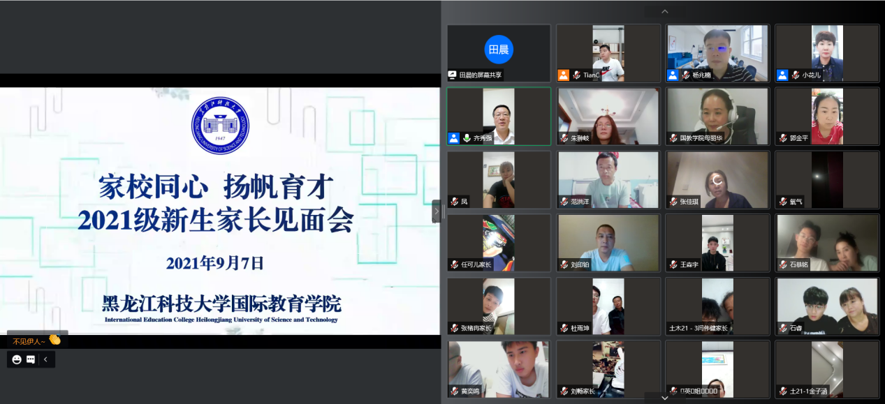 为了进一步增强家校互动,畅通家校互联途径,打通“最初一公里”,2021年9月7日19:30,国际教育学院通过腾讯会议的形式召开“家校同心 扬帆育才”2021级新生家长云端见面会。学院党委书记齐秀强,院长母丽华,党委副书记徐海英,副院长杨兆楠出席,全体2021级家长在新生陪同下参加,会议由学生工作办公室负责人田晨主持。