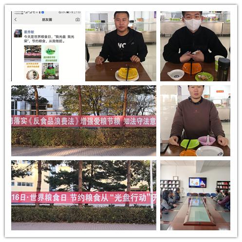 为贯彻落实全国公共机构能源资源节约和生态环境保护工作会议精神,按照黑龙江省机关事务管理局的通知要求,后勤管理处以10月16日第41个世界粮食日为契机,积极组织全校教职工和广大青年学生开展反食品浪费宣传教育活动。10月15日上午,组织教职工观看了国管局公共机构反食品浪费政策宣贯“云课堂”,10月16日·世界粮食日,开展了“我光盘,我光荣”,打卡朋友圈活动。