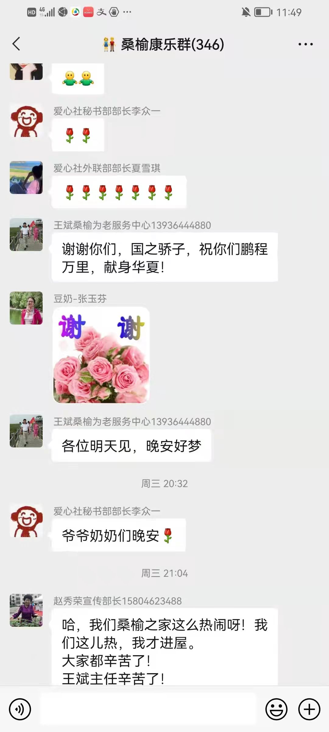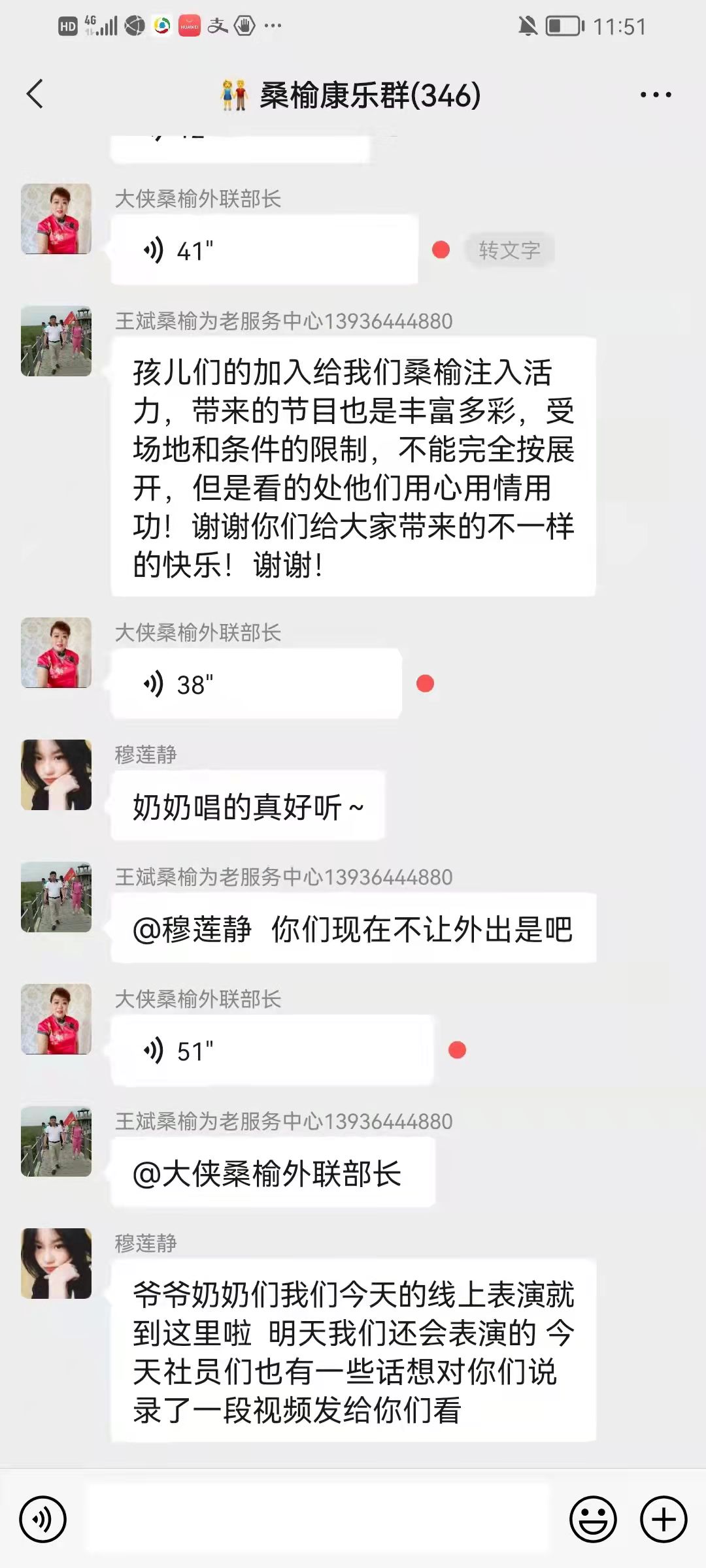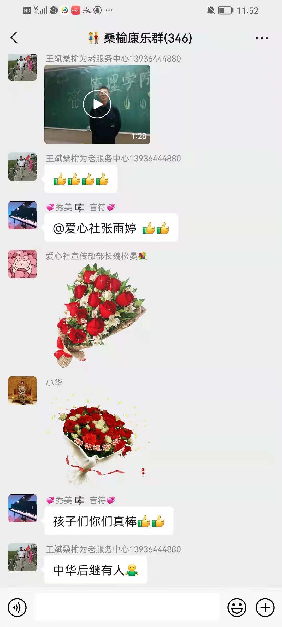 为了缓解他们居家期间情绪紧张的问题,爱心社的同学们以微信群内线上联欢的形式,录制了《太阳照常升起》口琴独奏等7个精彩的小节目,在学生们的带动下,群里的老人纷纷献唱《我和我的祖国》等歌曲,一同为祖国庆生。这种线上支持缓解了社区老人的心理压力,他们居家抗疫带来了欢声笑语。最后学生们录制了一个送出祝福的集体视频,把美好的祝愿送给了老人们,为这次线上服务画上了完美的句号。两天共服务7个小时,累计服务638人次。这次线上服务把抗击疫情必胜的信心带给了老人们,也体现了【官网】大学生的责任感和精神风貌。