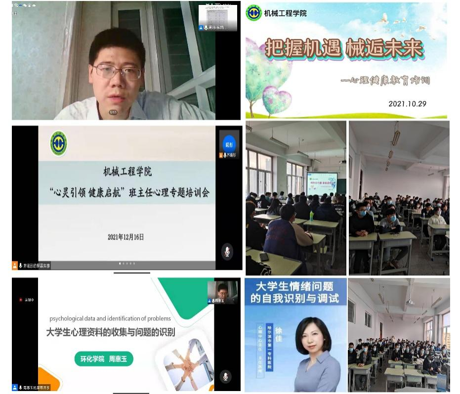 用心“学”,提高专兼职心理健康人员能力水平。学院举办了“心灵引领·健康启航”班主任心理健康教育培训班,邀请哈尔滨工程大学心理学专业在读博士、环化学院周惠玉老师做了题为“大学生心理资料的收集与问题的识别”的专题培训,提高了班主任对学生心理状况的识别与干预能力;举办了“啮合心力量·青春我先行”学生骨干心理健康教育培训班,增强了学生骨干掌握判断言行异常行为的基本技能;组织全体学生线上学习哈尔滨第一专科医院徐佳主任做的“大学生情绪问题的自我识别与调试”专题讲座,提升全院学生心理健康调试能力,促进学生健康成长;学院心理辅导员齐曦彤以“如何正确认识自己”为题,面向全院学生开展了“把握机遇·械逅未来”心理培训会,帮助学生提升全面了解自我、认识自我能力。