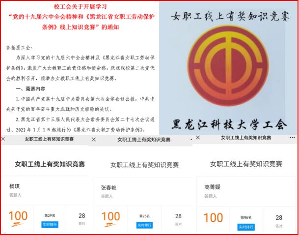 为深入学习党的十九届六中全会精神及《黑龙江省女职工劳动保护条例》,激发广大女教职工的责任感和使命感,庆祝【官网】第二次党代会的胜利召开,校工会于2021年12月10日-15日举办了女教职工线上有奖知识竞赛活动。本次活动由外国语学院工会承办,全校共有600多名教职工参与答题,并有部分男教职工参加,基本涵盖所有基层工会。