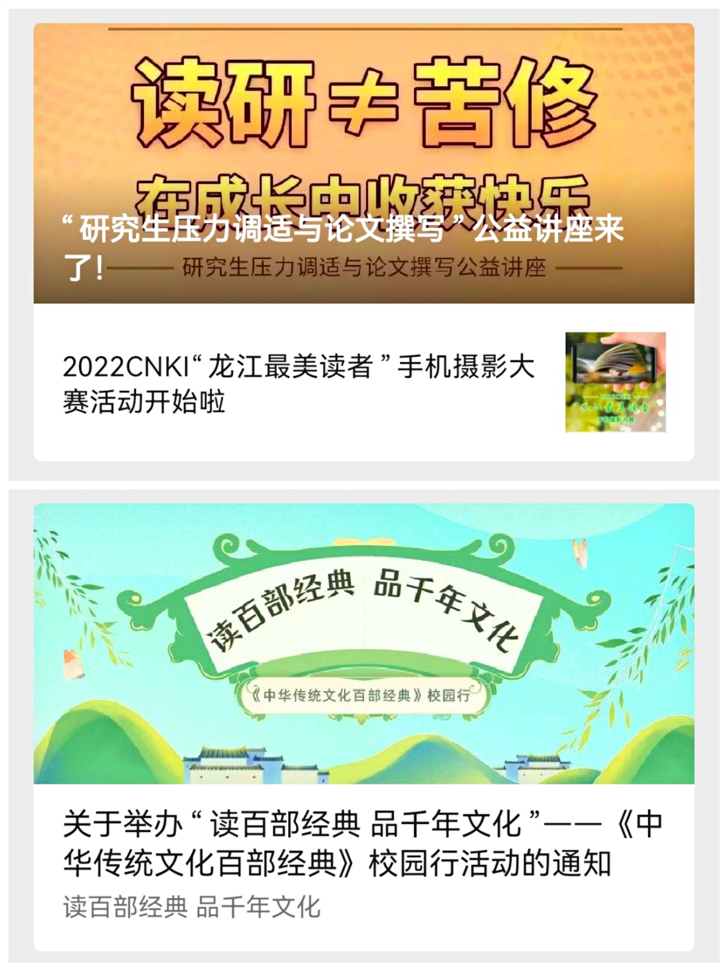为丰富学生读者校园封闭期间的文化生活,图书馆联合CNKI共同举办了“研究生压力调适与论文撰写”公益讲座和“龙江最美读者”手机摄影大赛,指导学生论文写作,传播阅读行为,激发阅读热情。