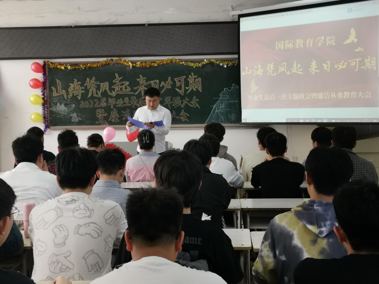 一堂“廉洁从业教育”课堂。6月3日,国际教育学院在科技大厦0617开展了“敬廉崇洁,诚信做人”廉洁从业教育大会。会上,院长母丽华为2022届毕业生开展了一次庄严而又细致的廉洁从业思政大课,要求毕业生们在新的人生征程上坚定理想信念、严守廉洁纪律、强化底线意识、坚持求真务实,做一个有社会责任感和奉献精神的栋梁之才。随后由毕业生代表孙薪峰宣读廉洁从业倡议书,引导毕业生们铭记“厚德博学,强吾兴邦”的校训,营造“敬廉崇洁,诚信做人”的良好气氛,发挥好校友名片作用,使廉洁诚信意识深入到思想当中。