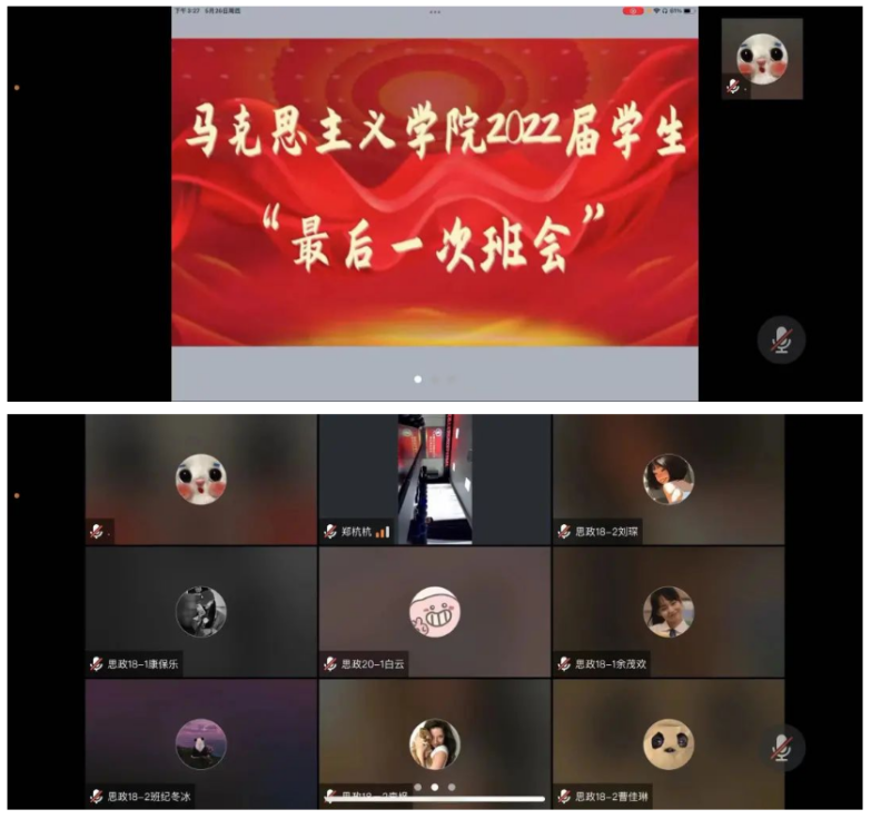 一次班会忆往昔。学院组织毕业生于5月26日下午以线上线下相结合的方式开展“一次班会忆往昔”活动。班主任高阳与全体毕业生回首四年校园时光。随后,毕业生纷纷向班主任表达感谢,毕业生之间互送祝福,班主任也为毕业生送上真挚祝福,展现了师生间的深厚情谊。