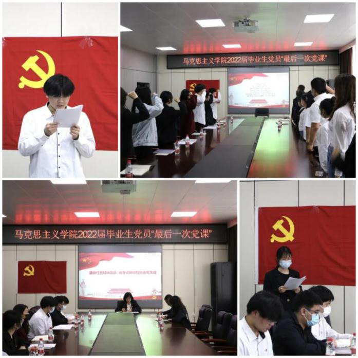 一堂党课守初心。为教育引导毕业生党员坚定理想信念,坚守入党初心,自觉赓续红色基因,5月25日下午学院以线上线下相结合的方式组织毕业生党员开展了“最后一次党课”主题党日活动。课堂上,毕业生党员代表带领全体毕业生党员回顾自己的入党志愿书和入党谈话,学院党委书记张影以《赓续红色精神血脉 做奋进新征程的青年先锋》为主题给全体党员讲了一堂精彩的党课。最后,全体党员共同重温入党誓词,激发了全体党员的使命感和责任感,使全体党员牢记共产党员的初心使命,强化党性观念,把爱国情、强国志、报国行融入到毕业后的人生征途,用奋斗书写人生华章。