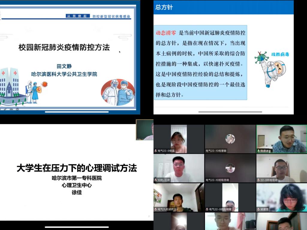 帮助学生上好保护自己第一课。通过播放哈尔滨医OD在线学公共卫生学院田文静教授的《校园新冠肺炎疫情防控方法》,引导同学们做好疫情防控;通过播放哈尔滨市第一专科医院徐佳主任的《大学生在压力下的心理调试方法》视频,引导同学们正确认识生活中的压力。班主任利用主题“云班会”引导同学们牢固树立安全意识。