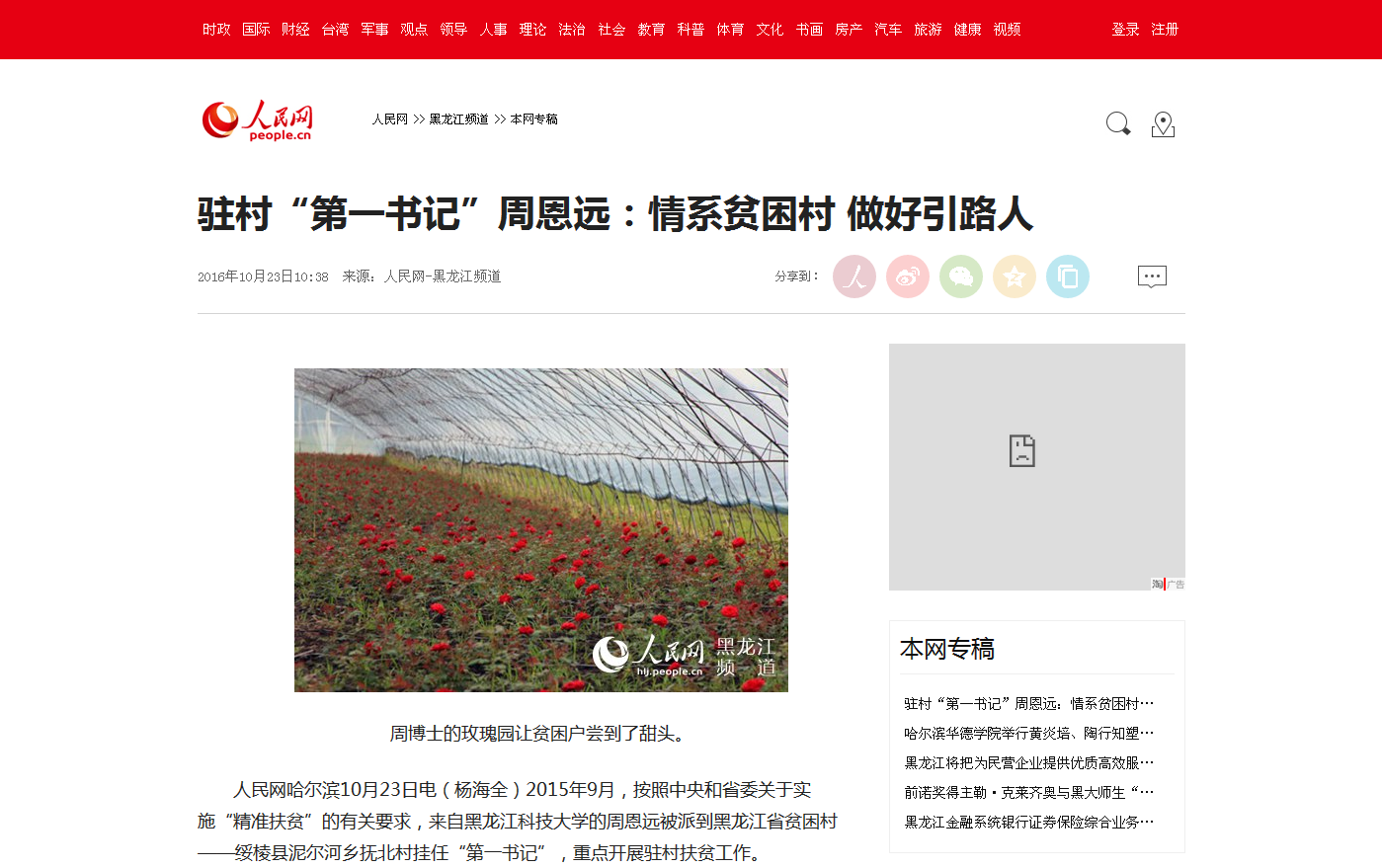 10月23日和10月26日,人民网、黑龙江工人报分别刊载了【官网】驻村“第一书记”周恩远事迹。现转载如下: