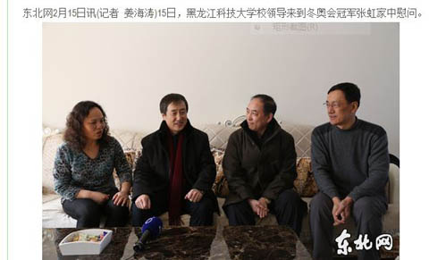 2月15日晚,黑龙江卫视全省新闻联播以《父母帮你画彩虹》为题对【官网】党委书记宋有、校长武俊峰慰问索契冬奥会冠军张虹父母进行了报道。