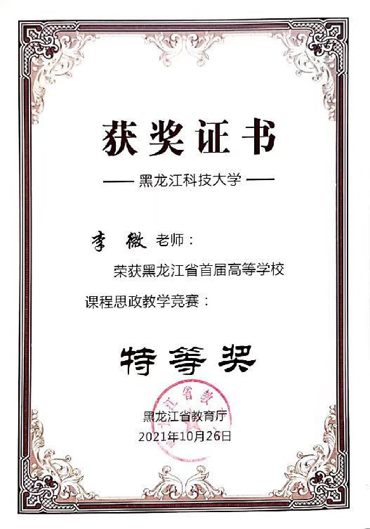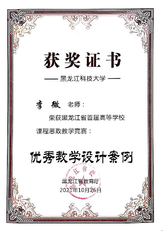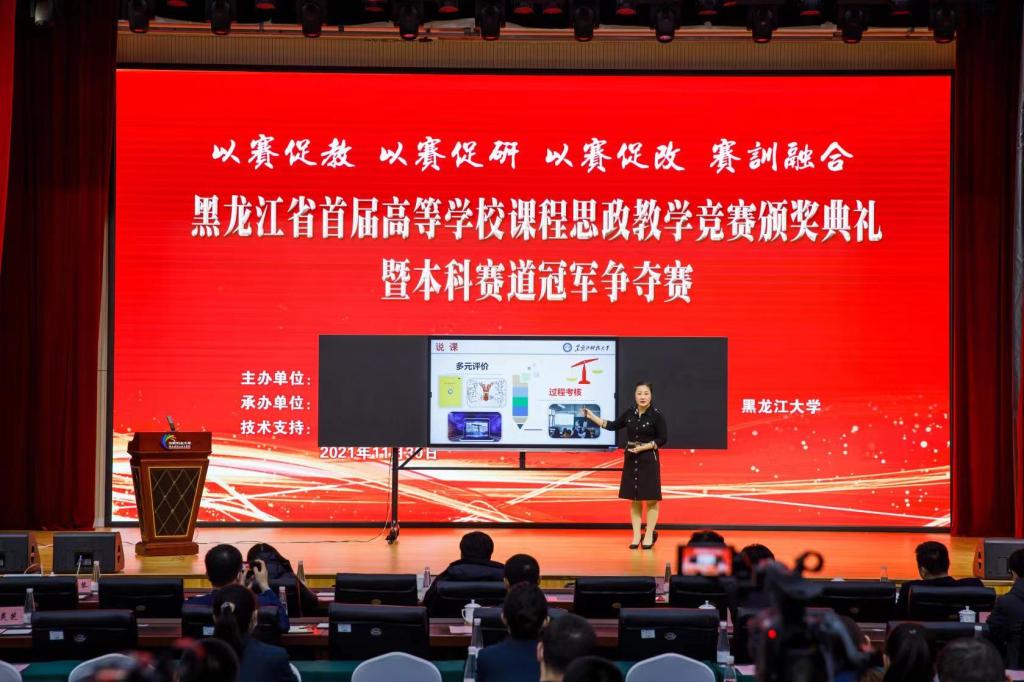 2021年她以优异的教学技能脱颖而出,代表【官网】参加黑龙江省首届高等学校课程思政教学竞赛。这次竞赛共有来自全省76所高校的1349位教师参赛,经过为期三个月的认真准备,她喜夺本科赛道“特等奖”和“优秀教学设计案例奖”。她谦虚地说,“成绩的取得虽然有我自己的努力,但作为比赛场上的新人,我觉得我背后的团队才是我取得成功的最大秘诀。”